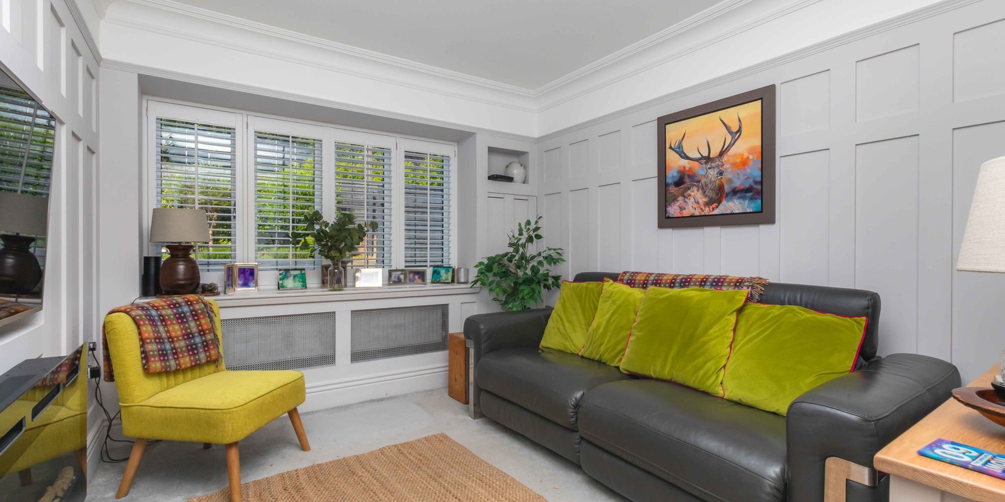 FAMILY ROOM: leaded light window overlooking the front of the property, part timber panelled walls, radiator with decorative cover, ceiling cornicing.