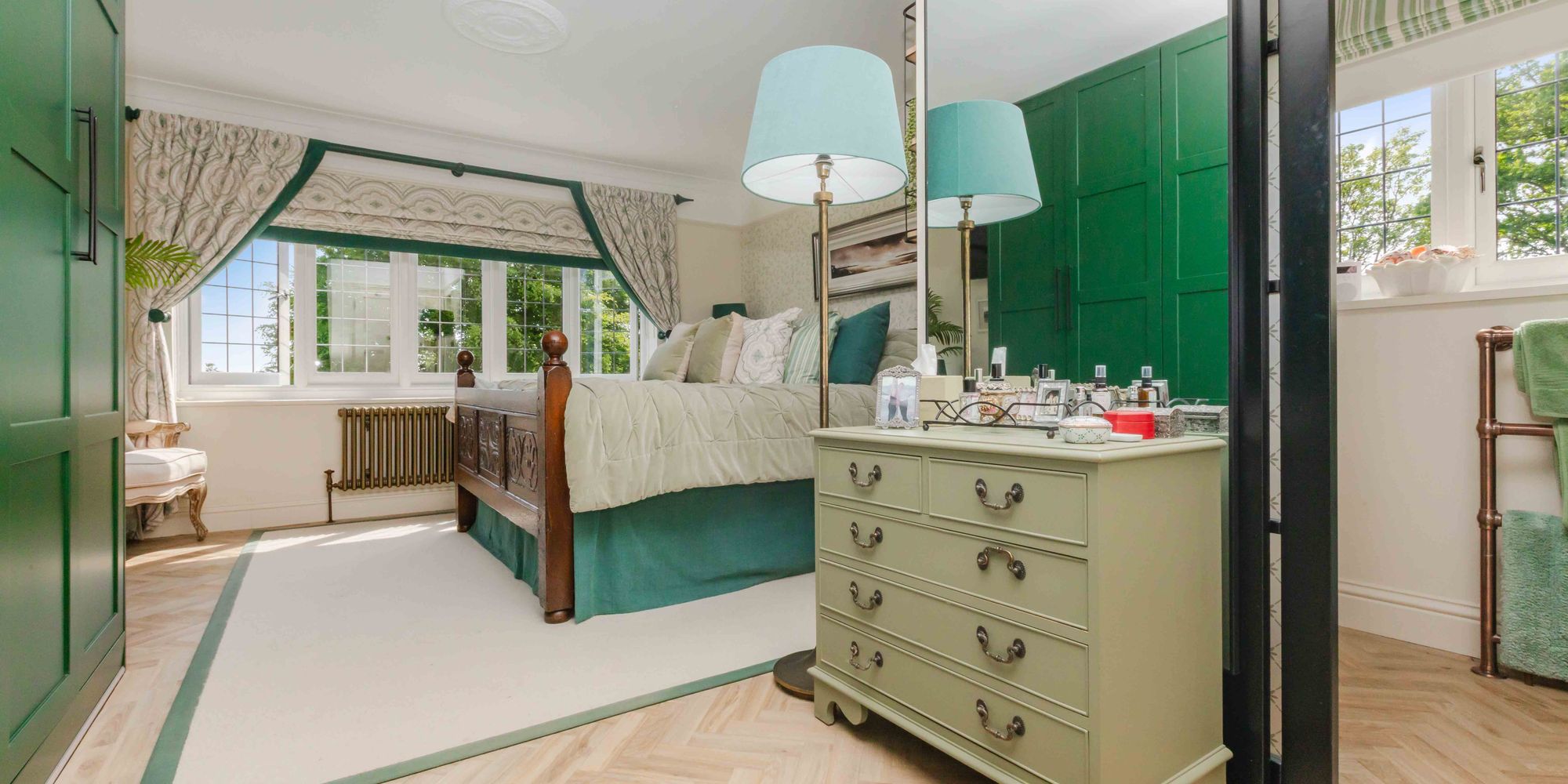 PRINCIPAL BEDROOM: leaded light window overlooking the rear of the property affording spectacular views across the gardens, grounds and countryside beyond, extensive range of built-in bespoke wardrobes, picture rail, ceiling cornicing, oak flooring, door into: EN-SUITE WC: comprising low level WC, vanity unit with inset washbasin, heated copper towel rail, leaded light window to side, picture rail, oak flooring, ceiling cornicing.