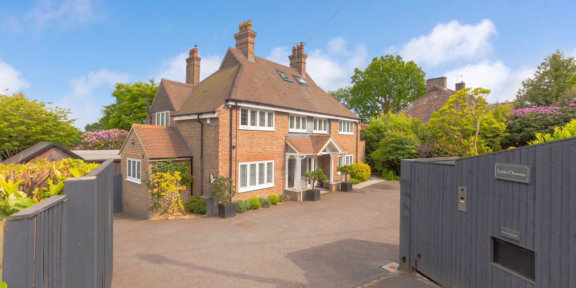 A comprehensively modernised and impeccably presented five bedroom (three bath/shower rooms) detached 1920’s home with beautifully landscaped secluded gardens located in a desirable central position within a stone’s throw of Crowborough town centre and a selection of schools. This exceptional and attractive home has been comprehensively modernised and improved in recent years to include rewiring, new gas central heating system, a new roof, replacement bath/shower suites, and the addition of a spectacular open plan kitchen/dining room. The gardens and grounds have recently been fully landscaped and offer total peace and seclusion with several seating terraces, large areas of lawn and extensively stocked flower and shrub beds, the whole fully enclosed by thick natural hedging and mature trees. Within the grounds there are several useful, modern outbuildings to include an outside kitchen and shower room, a detached studio/large home office and an additional and recently constructed boot room with extensive built-in storage cupboards (this could be used as a gymnasium or additional home office if required). The light and generously proportioned accommodation extends to just under 3,000 sq. ft. and comprises in brief on the ground floor, a wide gabled entrance, a dining hall with attractive fireplace, an inner hall, cloakroom, useful utility room, a family room, a large double aspect bay fronted sitting room with handsome fireplace and wood burner and a magnificent open plan 24’6 x 21’8 open plan refitted kitchen/dining/family room with twin plate electric Aga, integrated appliances, granite work surfaces and twin glazed double doors opening to the terrace and gardens. From the dining hall, a bespoke staircase ascends to the galleried first floor landing, a master bedroom with extensive built-in wardrobes and en-suite WC, a guest bedroom with beautifully refitted en-suite bath/shower room, two further first floor bedrooms and a beautifully refitted family bath/shower room whilst the second floor provides a further generously proportioned double aspect bedroom. Outside, the property is approached via electronically controlled tall timber gates which give access to a large tarmacadam driveway providing parking for an extensive number of vehicles, flanked by extensively stocked flower and shrub beds and mature trees. The rear gardens provide an outstanding backdrop and offer peace and seclusion. EPC Band C. Council Tax Band F..