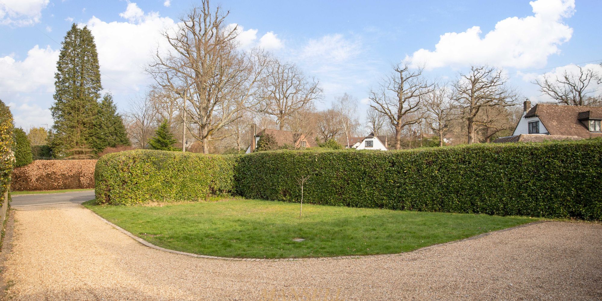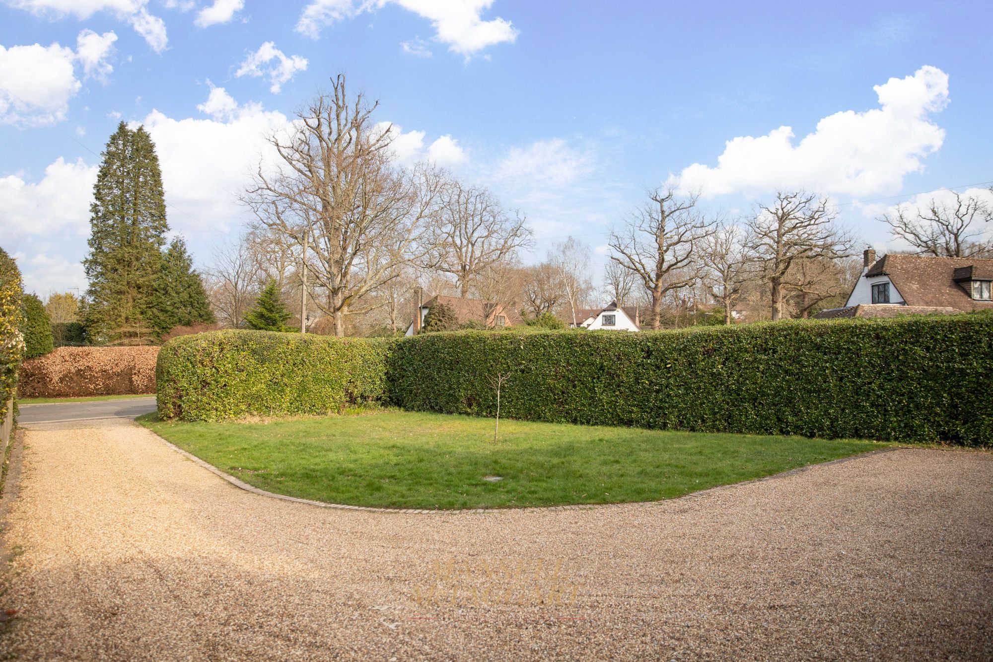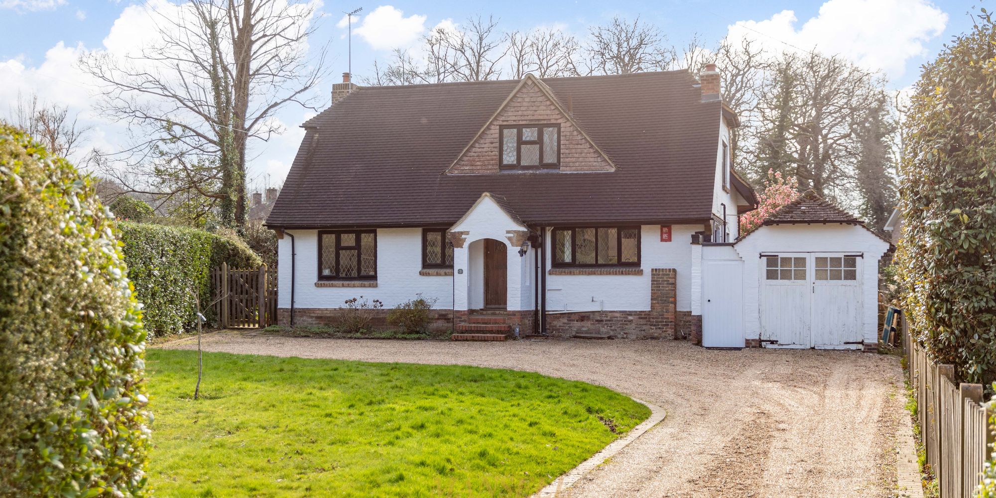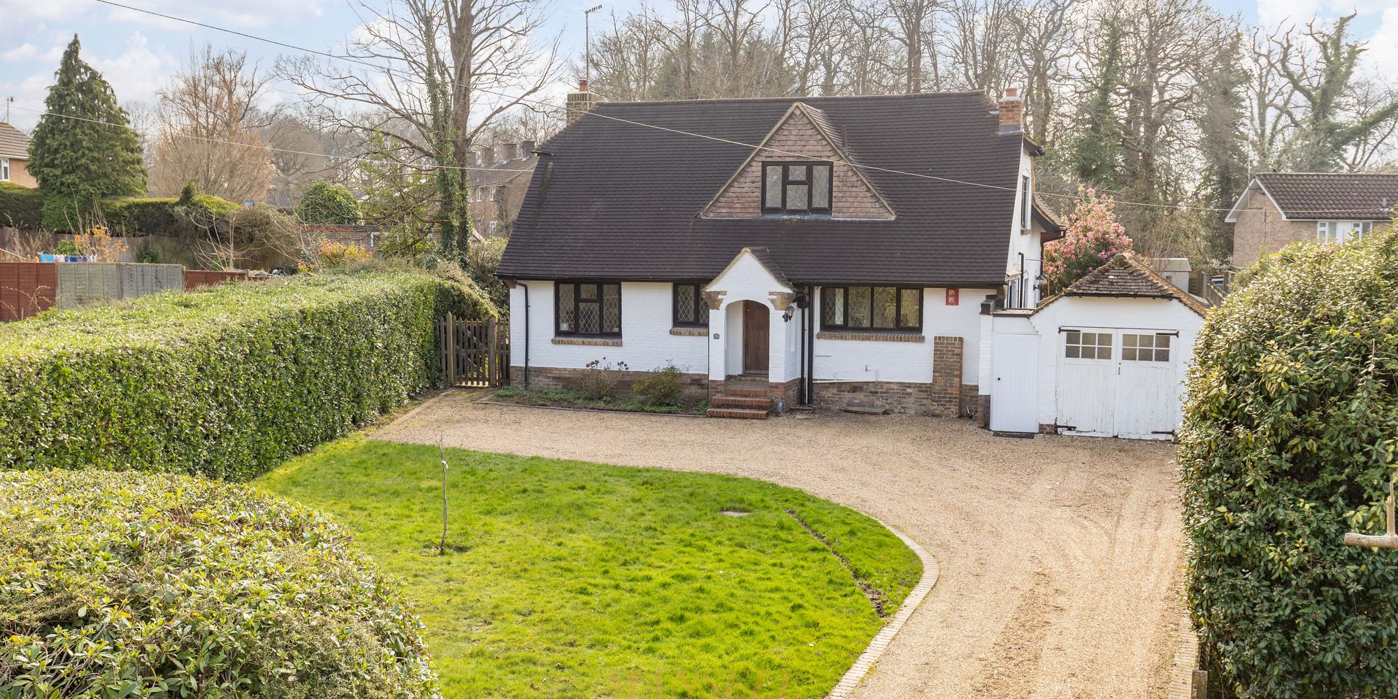 To the front is a lengthy gravelled driveway providing off-road parking for numerous vehicles leading to a single garage with double doors to front, power and light. The whole area to the front is screened by well-kept hedging with an area of lawn and gated side access.